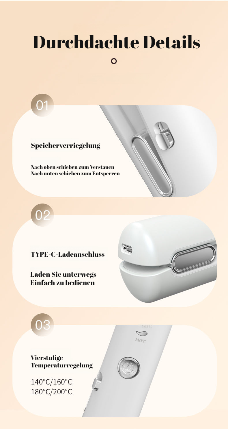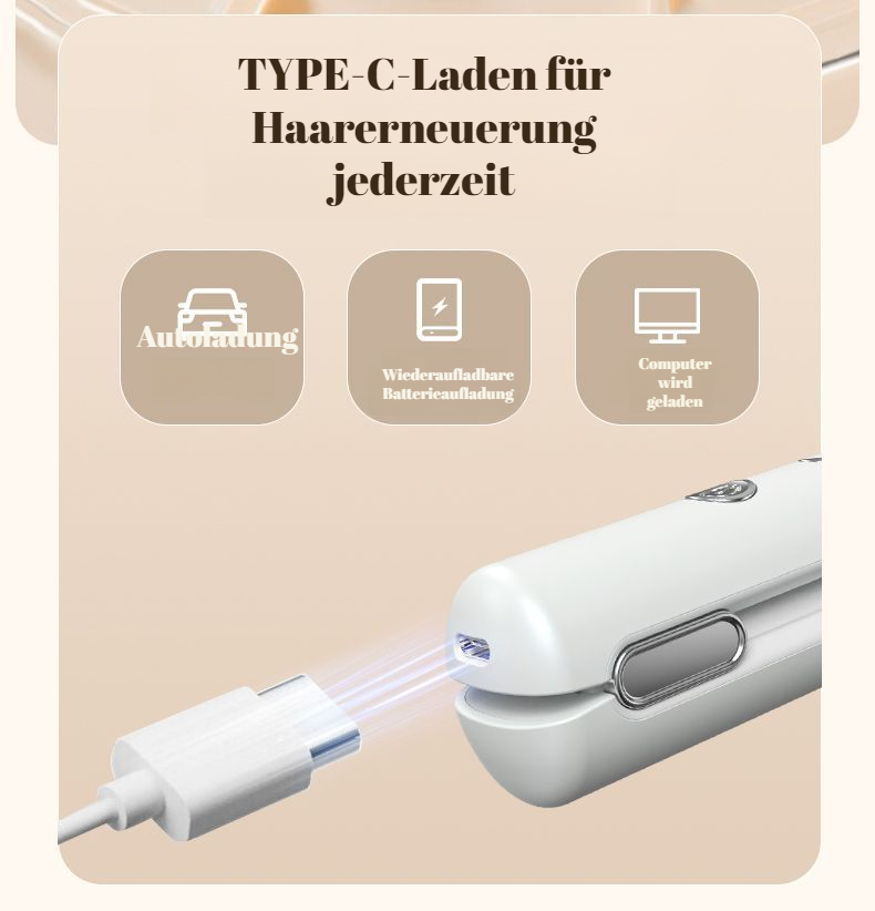 ● Kabelloser, tragbarer Haarglätter und Lockenstab mit USB-Aufladung – ideal für unterwegs, Reisen und schnelle Styling-Sessions überall. ● Innovative 2-in-1 Funktion: Glätten und Locken mit nur einem Gerät, spart Platz und bietet maximale Flexibilität für jeden Look. ● Schnelle Aufheizzeit und konstante Temperatur sorgen für professionelles Styling ohne Haarschäden – perfekt für alle Haartypen. ● Kompaktes, leichtes Design passt in jede Handtasche und ist der perfekte Begleiter für spontane Styling-Momente. ● Einfache Bedienung und kabellose Freiheit ermöglichen ein unkompliziertes Styling, wann und wo Sie wollen – ohne Einschränkungen.